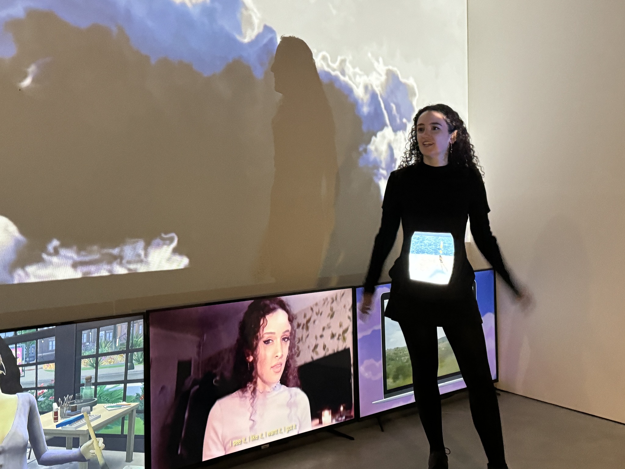 karaoke, usa filtros de tik tok, deixa-nos ler as suas conversas no WhatsApp (será?). Estamos sempre a vê-la, mesmo que não nos apercebamos disso. Dos vídeos apresentados em múltiplos ecrãs, afirma “estes aqui ainda vão dar origem a outra coisa, mais longa, no futuro”, dando-nos a entender que estamos perante o seu processo de trabalho, o seu pensamento e ao mesmo tempo a possibilidade de ver ali um coletivo, uma geração inteira.
